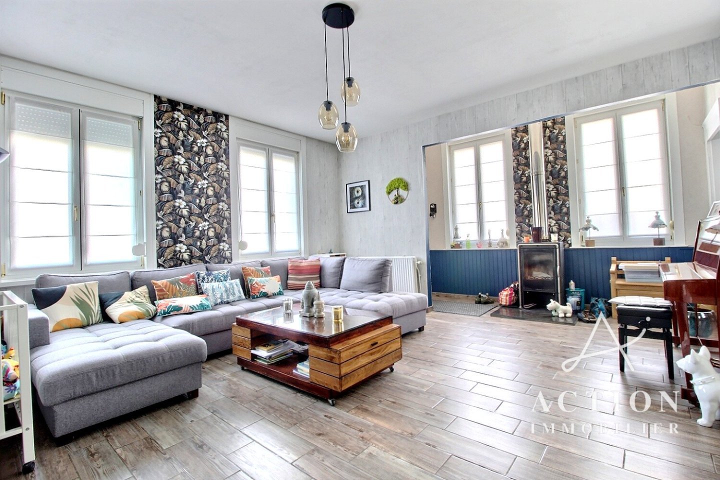 - Espace de vie cocooning avec cheminée au bois