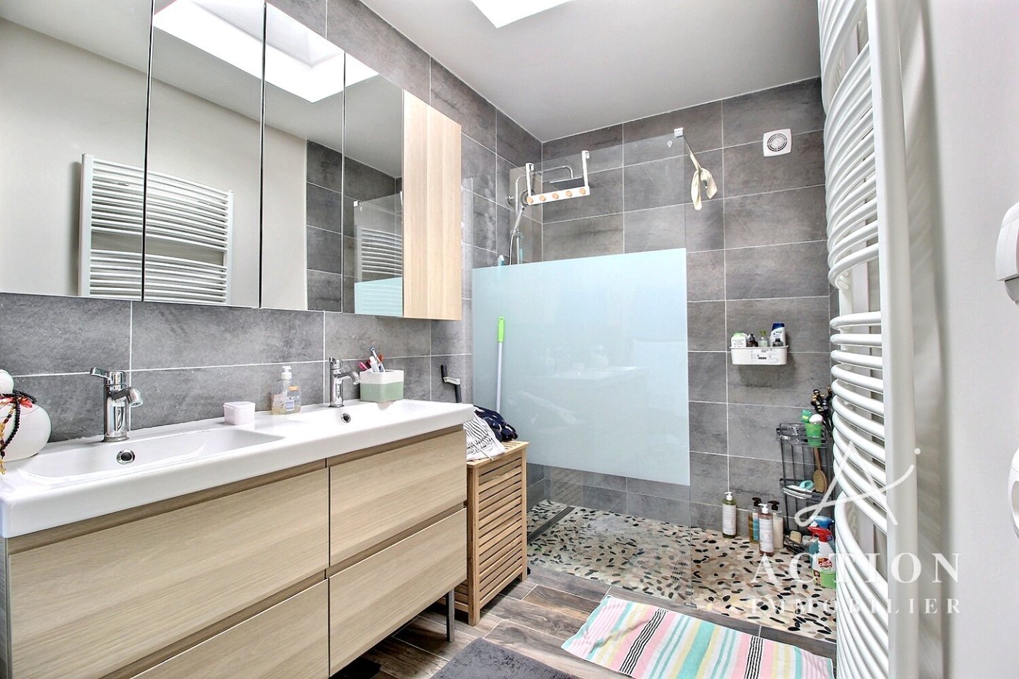 Au rez-de-chaussée, vous trouverez une très belle salle de bain avec douche à l'italienne et double vasque. Un WC complète ce niveau.