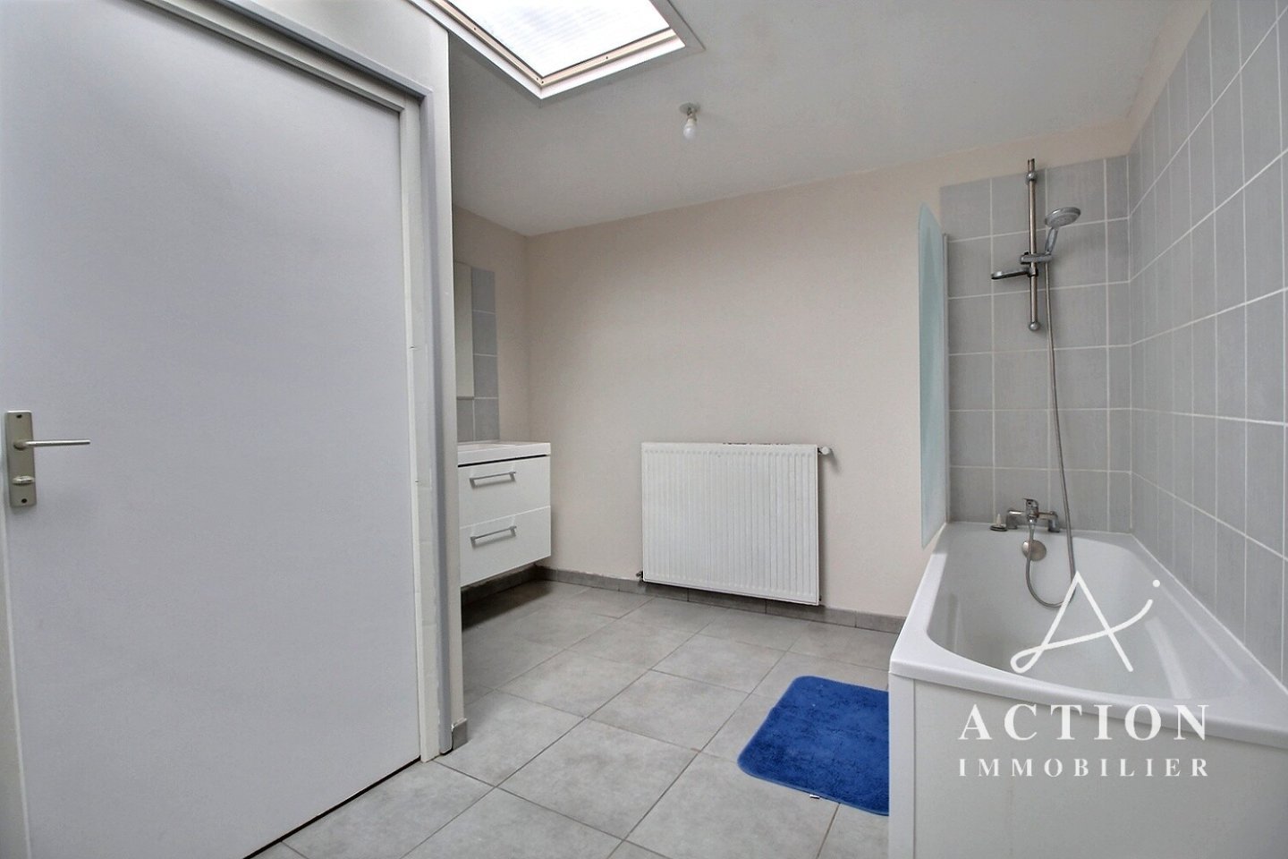 Ce niveau comprend également une salle de bain équipée d'une baignoire et d'un meuble vasque, ainsi qu'un WC séparé et une buanderie pour votre confort au quotidien.